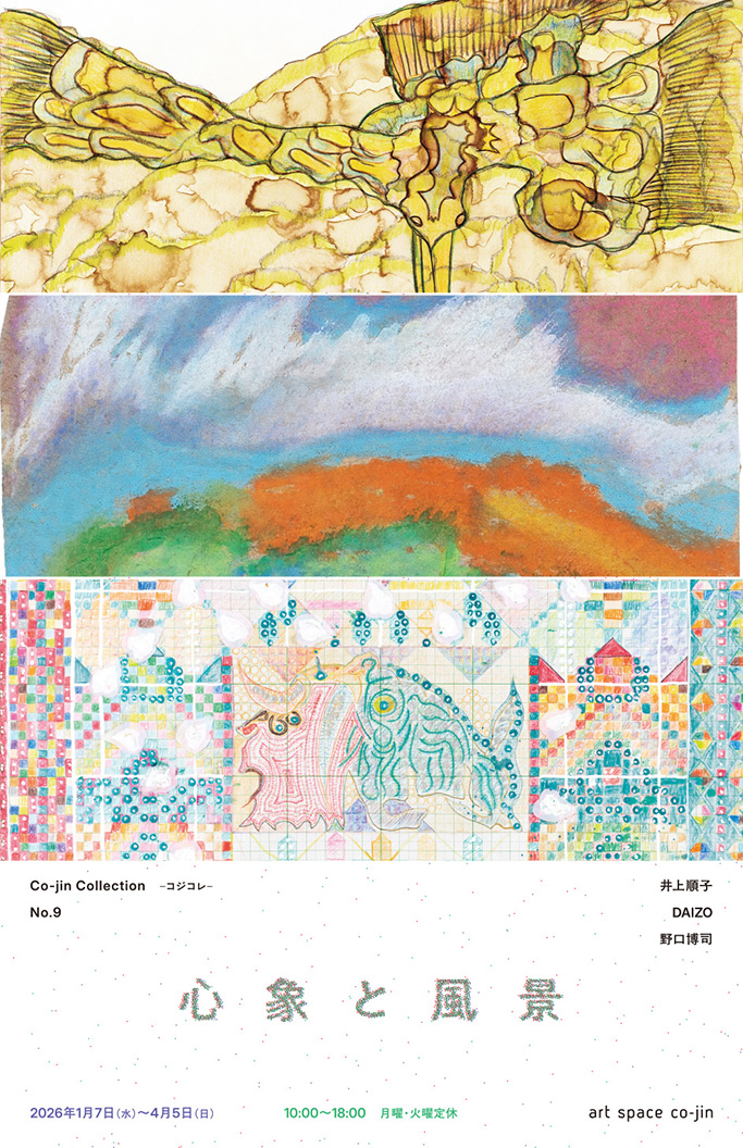 「Co-jin Collection – コジコレ -」は公募展「京都とっておきの芸術祭」の出品作の中から、co-jinスタッフが気になる表現を取り上げてご紹介する企画展です。9回目となる今回は「心象と風景」をテーマに3名の作家をセレクトしました。