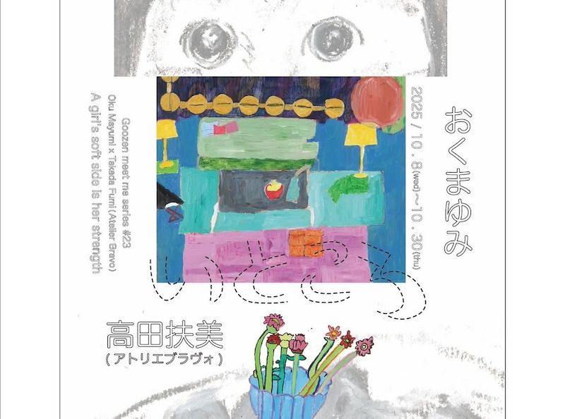 展示 開催中 展示 開催中 Goozen meet me シリーズ #23 おくまゆみ x 高田扶美(アトリエブラヴォ)『やわらかいところ』 2025.10.8wed–10.30thu会場:Goozen詳細を見る