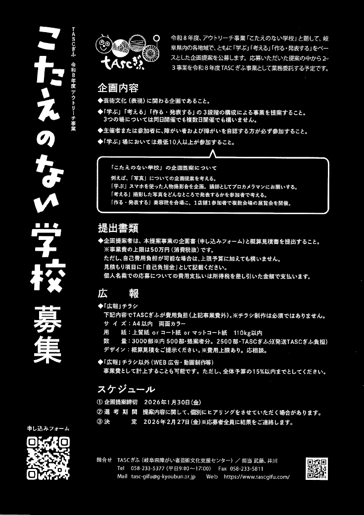 令和8年度、アウトリーチ事業「こたえのない学校」と題して、岐阜県内の各地域で、ともに「学ぶ」「考える」「作る・発表する」をベースとした企画提案を公募します。応募いただいた提案の中から2から3事業を令和8年度TASCぎふ事業として業務委託する予定です。