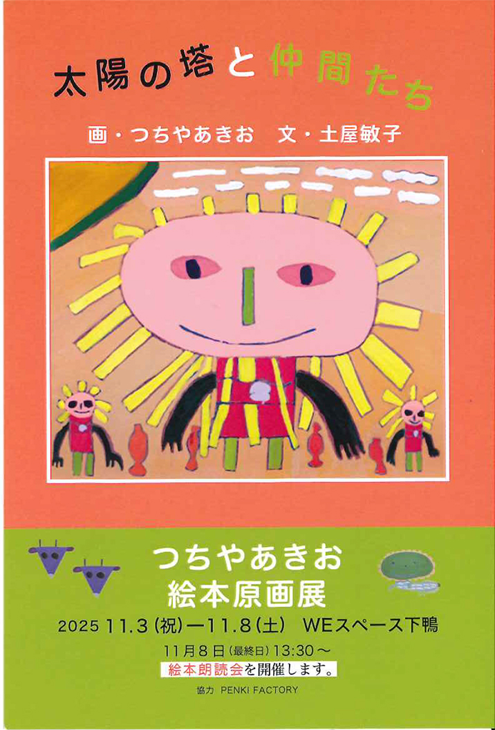 展示 つちやあきお 絵本原画展 2025.11.3mon–11.8sat 会場:WEスペース下鴨(京都) 11月8日(最終日)13:30〜 絵本朗読会を開催します。 日程 2025年11月3日(月)–11月8日(土) 11:30-17:00 会場 WEスペース下鴨(京都) WEスペース下鴨 アクセス 京都市左京区下鴨宮崎町118番地