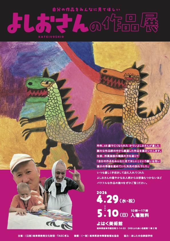 生前、所属施設の職員の方を通じて「自分の作品をみんなに見てほしい」という願いを伺い展示の準備を進めていた矢先の別れでした。いつも優しく手招きして、迎え入れてくれたよしおさんの穏やかなお人柄からは想像できないほどパワフルな作品の数々をぜひご覧ください。