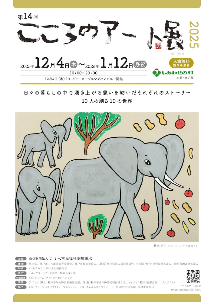 展示 第14回こころのアート展2025 2025.12.4thu–2026.1.12mon 会場:しあわせの村 日程 2025年12月4日(木)–2026年1月12日(月) 10時~20時 会場 しあわせの村 展覧会ウェブサイト アクセス 神戸市北区しあわせの村1-1 料金 無料