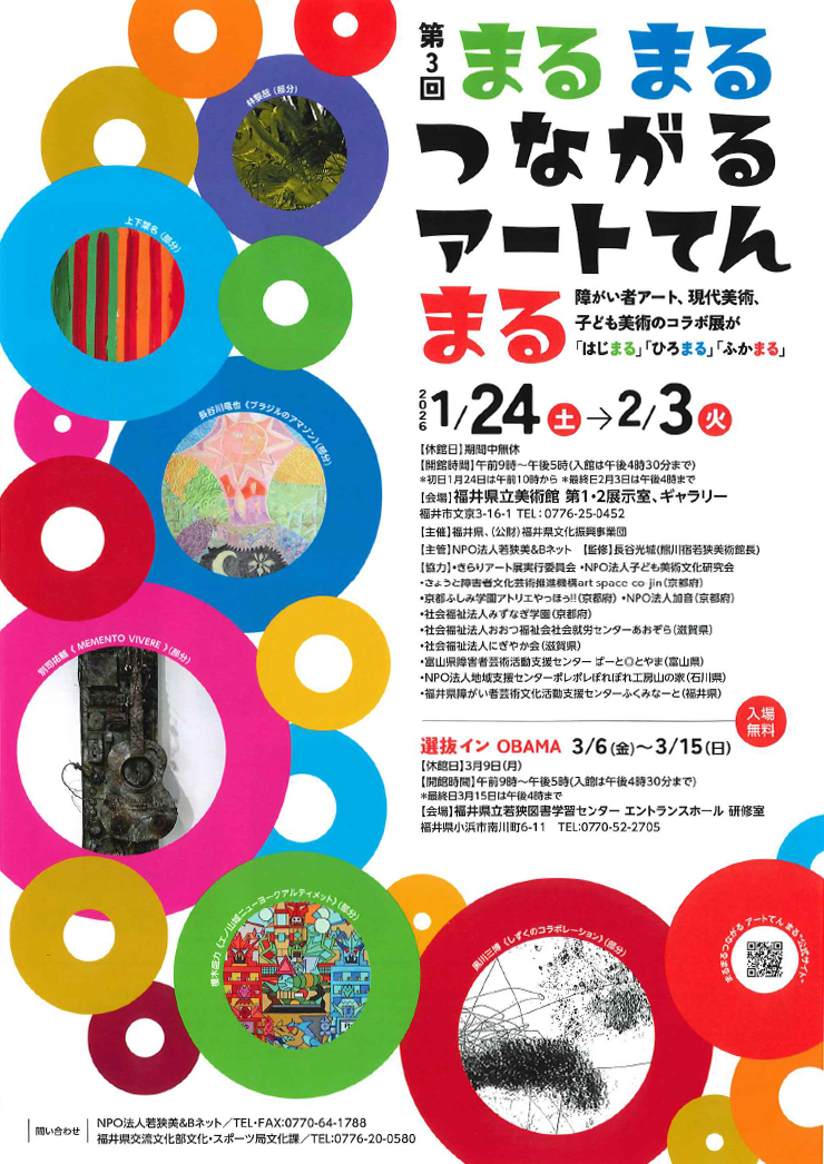 このようなことから命名された全国唯一のコラボ展「まるまるつながるアートてん まる」展を、真の共生社会の実現を目指して1昨年、昨年に引き継いて開催します。