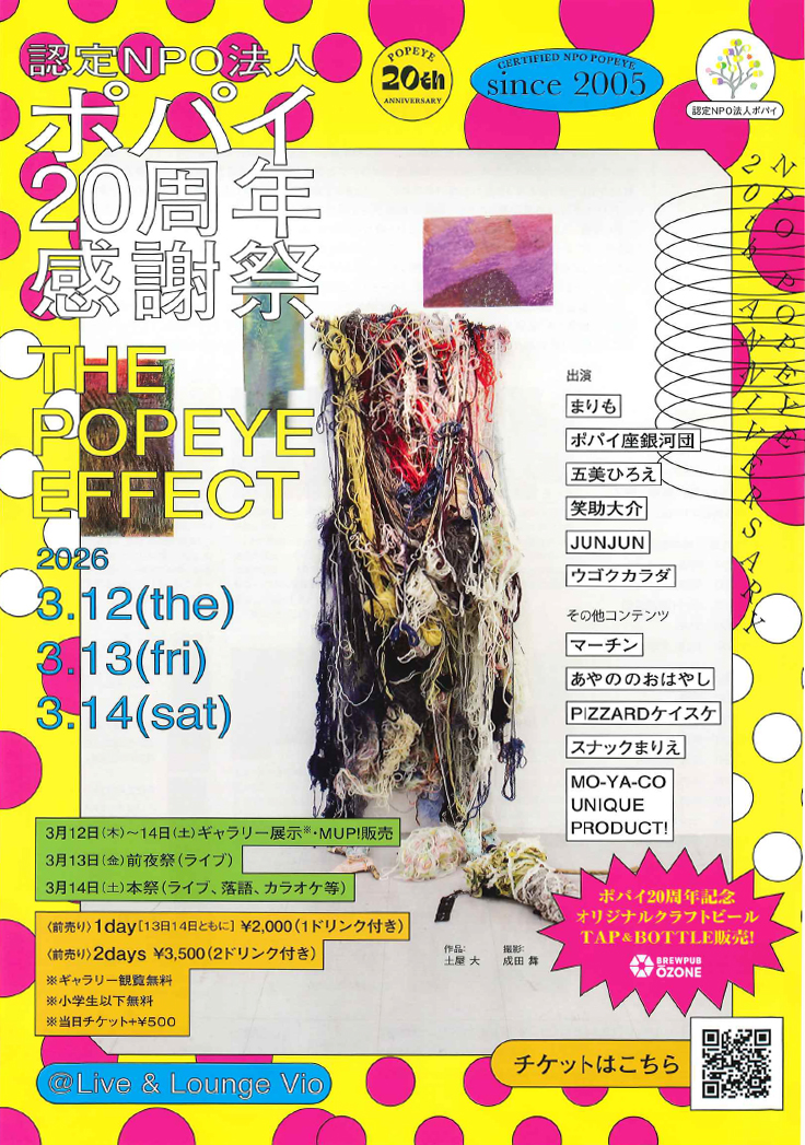 一方、名古屋市北区のポパイは20年でどれほどのエフェクトを生むことができたでしょうか?言葉や形に表しにくい福祉の「効果」や「成果」を、ポパイの初期メンバーと共につくる3日間の感謝祭で少しでも感じていただけると嬉しいです。気持ちは筋骨粒々で皆さんのお越しをお待ちしてます。「ほうれん草エフェクト」をどうぞお楽しみください。
